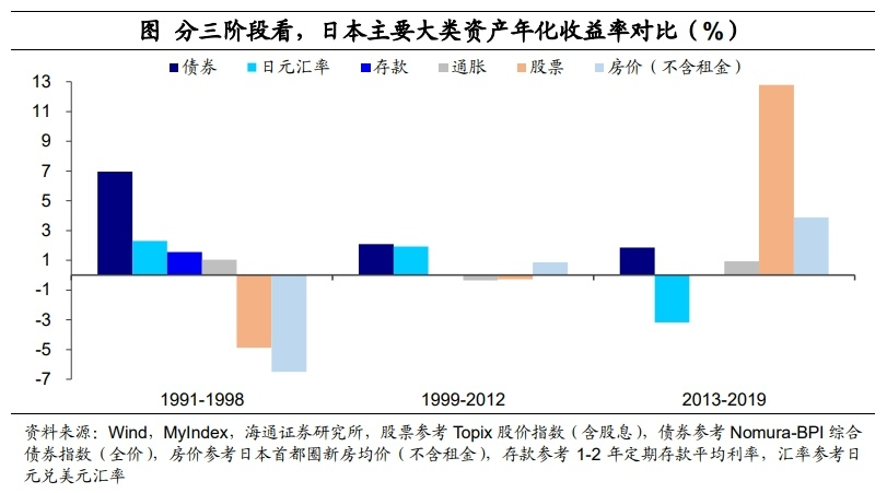 第三阶段,2013年开始随着日本经济恢复,股票资产的收益率大幅领先(年化收益12.8%);房价水平也在逐步修复,涨幅略超过债券资产。