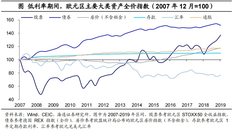 欧元区整个低利率周期,大类资产收益率呈现:债券>股票>物价>房价>存款>汇率。以2007年底作为起始,到2019年,除欧元兑美元汇率以外,其他资产最终均实现正增长。但其中平均房价和存款收益长期跑输当地CPI。从价格波动看,欧元区股指和汇率的波动率也相对较高。