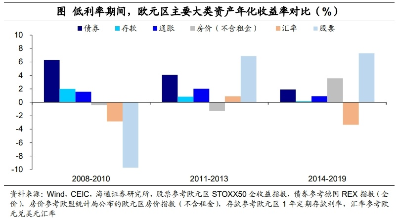 与日本类似,在利率快速下行阶段(2008-2010年),欧元区的债券资产涨幅也明显领先(年化6.3%)。存款类资产也有稳定的收益,跌幅最大的则是股票资产。
