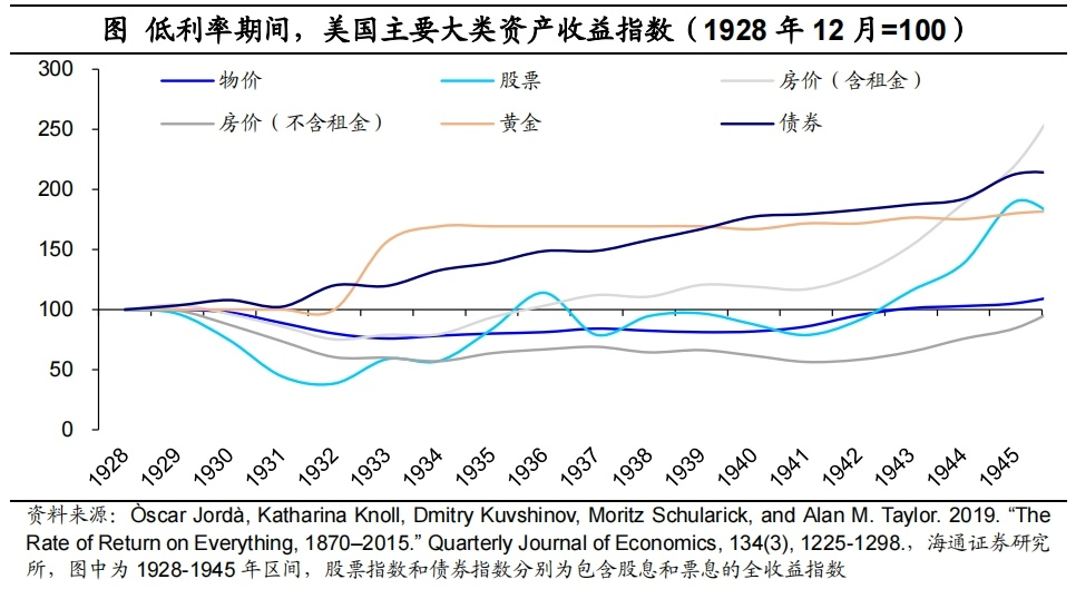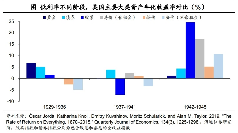 至于美国20-30年代低利率区间内,对比大类资产收益率:房价(含租金)>债券>股票>黄金>物价>房价(不含租金)。从1929年开始,到1945年二战结束,除了不含租金的房价外,其他资产均实现了正收益。但股票、房价(含租金)指数的快速上升期主要从1942年才开始,主要是因为美国在二战期间货币和财政政策大幅刺激,经济就业不断恢复。