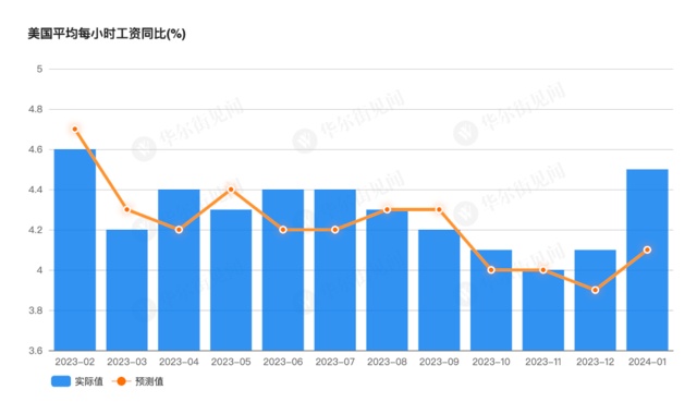 非农数据报告还显示,失业率持平上月,连续第三个月在3.7%,低于市场预期的3.8%,有力抑制了对于美国经济衰退的猜测;同时,美国1月平均每小时工资增速同比达到4.5%,创2022年3月以来最高,高于预期的4.1%,12月的工资增速也由4.1%上修至4.3%,环比增速达到了0.6%,为预期0.3%的两倍。