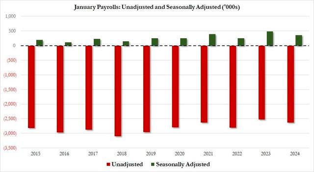 此外,美国1月季调后非农就业人口增加35.3万人,为2023年1月以来最大增幅,接近预期的2倍,但未经调整的就业人数为下降263.5万,即经季调后的就业人数增加了300万——也就是说,季节性调整中只要有出现大约10%的误差,就可能抹去整个增幅,使1月份的增幅变为降幅。这或许说明,1月非农就业人数季调后的增长很“难得”。