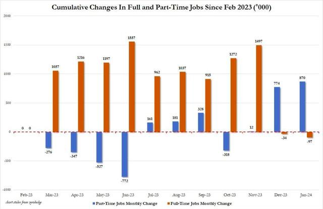 更进一步从工作类型来看,1月美国共有1.331亿个全职工作岗位、2790万个兼职工作岗位,而在2023年2月,全职工作的岗位为1.332亿,整整比当前水平高出20万。这说明,自2023年2月以来,增加的87万个工作岗位几乎都是兼职。