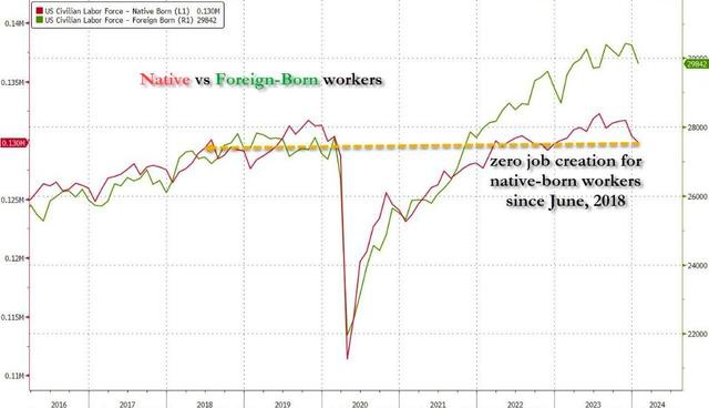 此外,从就业群体来看,在过去的两个月里,本土出生的就业人数减少的数量达到创纪录的190万人,回落至2018年疫情前的水平。也就是说,2018年7月以来,本地人群就业的机会并没有增长多少。