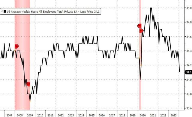 平均工作时间也降至阶段低位,1月份非农就业人员的平均每周工作时间下降了0.2小时至34.1小时,全年下降0.5小时,降至新冠危机最严重时期的最低水平,导致市场对于美国经济迈入衰退的担忧升温。