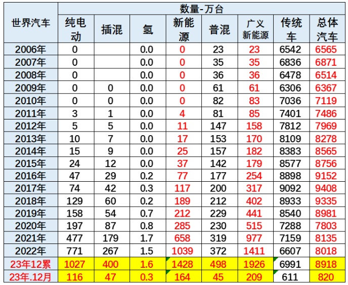 2023年1-12月份,世界汽车销量8918万台,其中新能车汽车销量1428万台,燃油车销量占比相对下降。12月份汽车销量达到820万台,新能源汽车达到164万台。