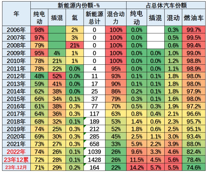 纯电动车的占比达到11.5%,其中12月份达到14.2%,而插电混动是达到4.5%的汽车比例,其中12月份达到5.7%的比例,而混合动力是全年占到5.6%,12月份达到5.5%的比例。