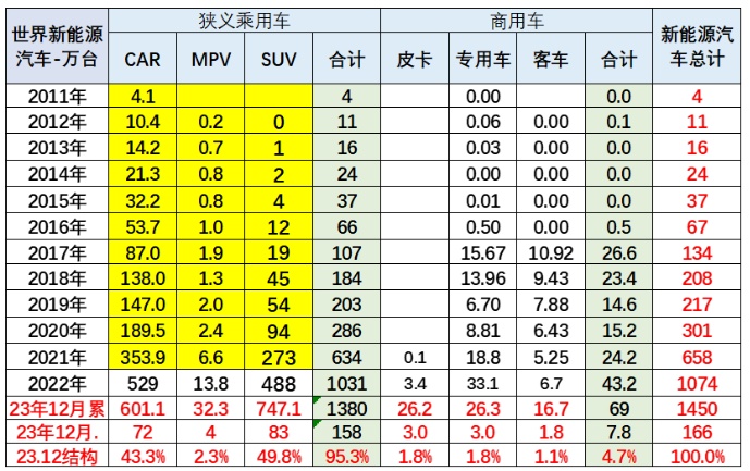 智通财经APP获悉,2月3日,崔东树发文称,2023年世界新能源汽车走势较稳,2023年世界汽车销量8918万台,其中新能车汽车销量1428万台,燃油车销量的占比相对下降。12月份汽车销量达到820万台,新能源汽车达到164万台。12月中国新能源低基数高增长进一步稳定全球增速。2023年1-12月中国新能源乘用车占比世界新能源63.5%,其中12月中国占比份额68%的表现较强。2023年中国新能源车出口超强,在东南亚和欧洲市场表现很好,这也是中国产业链强大,形成强大的国内市场和出口的双增长。