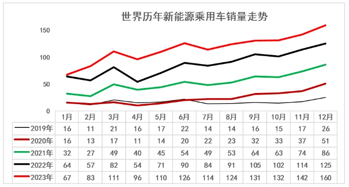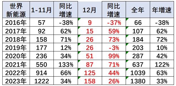 2023年世界新能源乘用车走势较强,1-12月达到1380万台,同比增长33%;12月达到158万台,同比增长26%。相对前几年的走势稍有减速。