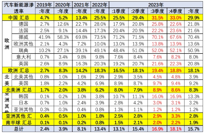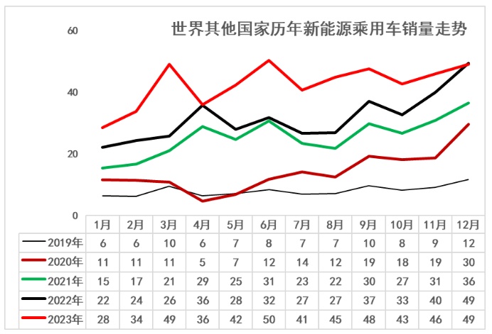 2023年的新能源减速趋势明显。中国的新能源政策调整因素影响1月较大,2-12月已经逐步恢复,尤其几个低基数月度对销量贡献较大。前期连续几年世界新能源销量已经低于40%增速。