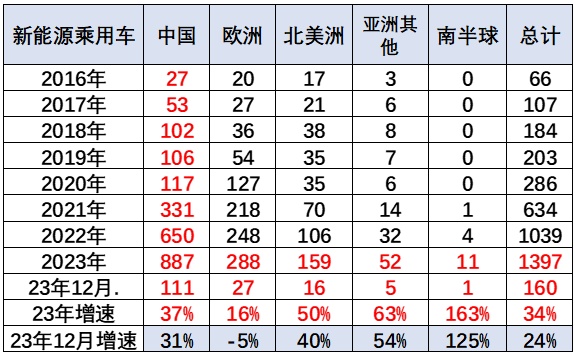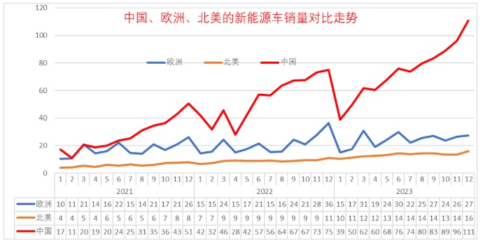 根据全国乘联会数据:中国2023年1-12月的销量887万台,继续大幅超越欧洲和北美洲的销量,中国新能源车总量优势明显。