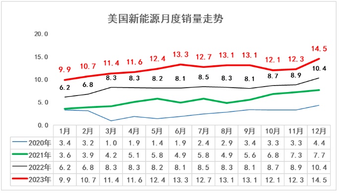 2023年中国新能源车销量回落较大,欧洲也是政策退出,美国上半年新能源车市较强,12月出现明显回升特征。美国新能源的销量增速放缓,库存压力较大,经销商抱怨很明显。