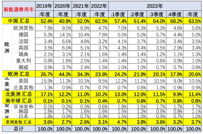 2021年全年的欧洲新能源市场受疫情影响,新能源增长较弱。2022年仍受到疫情影响,欧洲2022年较2021年份额下降较大,2023年欧洲份额仍然下降。