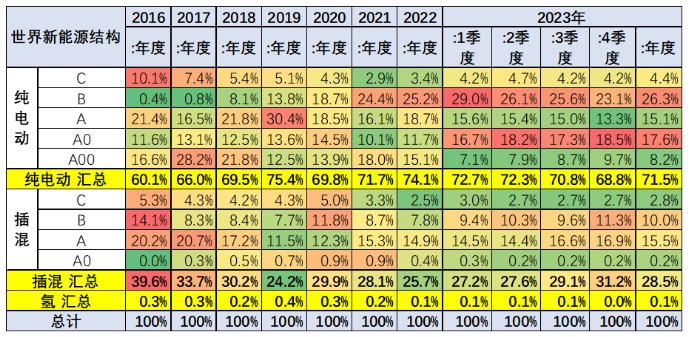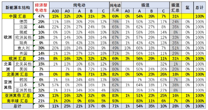 世界B级电动车的占比较高,而A级的占比偏低,这也是特斯拉的世界布局的特色效果。