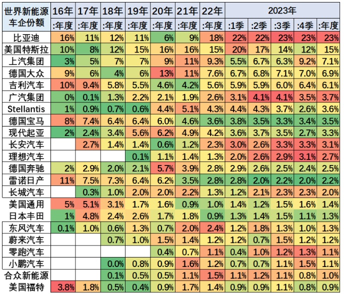 从历年销量份额看,中国的比亚迪世界领先,上汽集团的新能源表现不错,上汽乘用车和上汽五菱两家自主车企表现很好。德国大众的新能源车表现较强,宝马集团、韩国现代等保持在第二梯队水平。