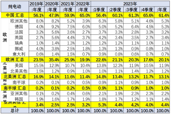中国在世界纯电动车市场份额表现相对突出,2017-2018年是在60%左右的份额;2019-2020年份额稍微有所下降,降到2020年的48%的份额;2022年又回升到65%的份额;2023年1-12月的份额达到61.4%的份额水平,表现相对平稳。