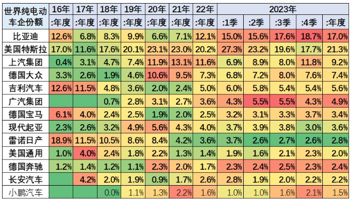 从车企的纯电动份额来看,比亚迪的份额总体来看持续上升。从2017-2021年总体保持在7%以上的份额水平,但2022年的份额上升到12%,2023年的份额上升到17%的表现良好。