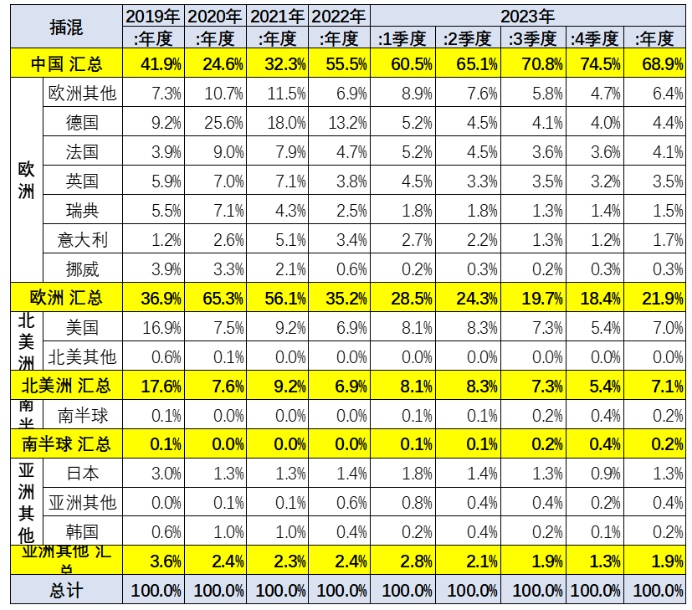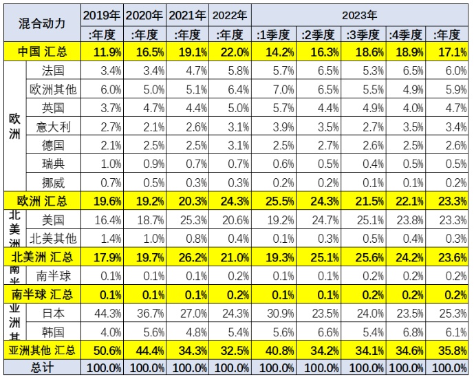 中国近两年混动高速发展,2022年成为世界较大的混动市场,2023年混合动力份额下降,美国和日本的混动市场回升。