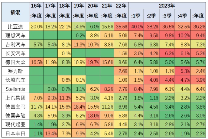 从车企的插电混动份额来看,比亚迪表现最为突出。比亚迪2021年上升到16%的水平,2023年1-12月上升到世界插电混动份额36%的水平,体现了比亚迪插电混动市场的良好表现。