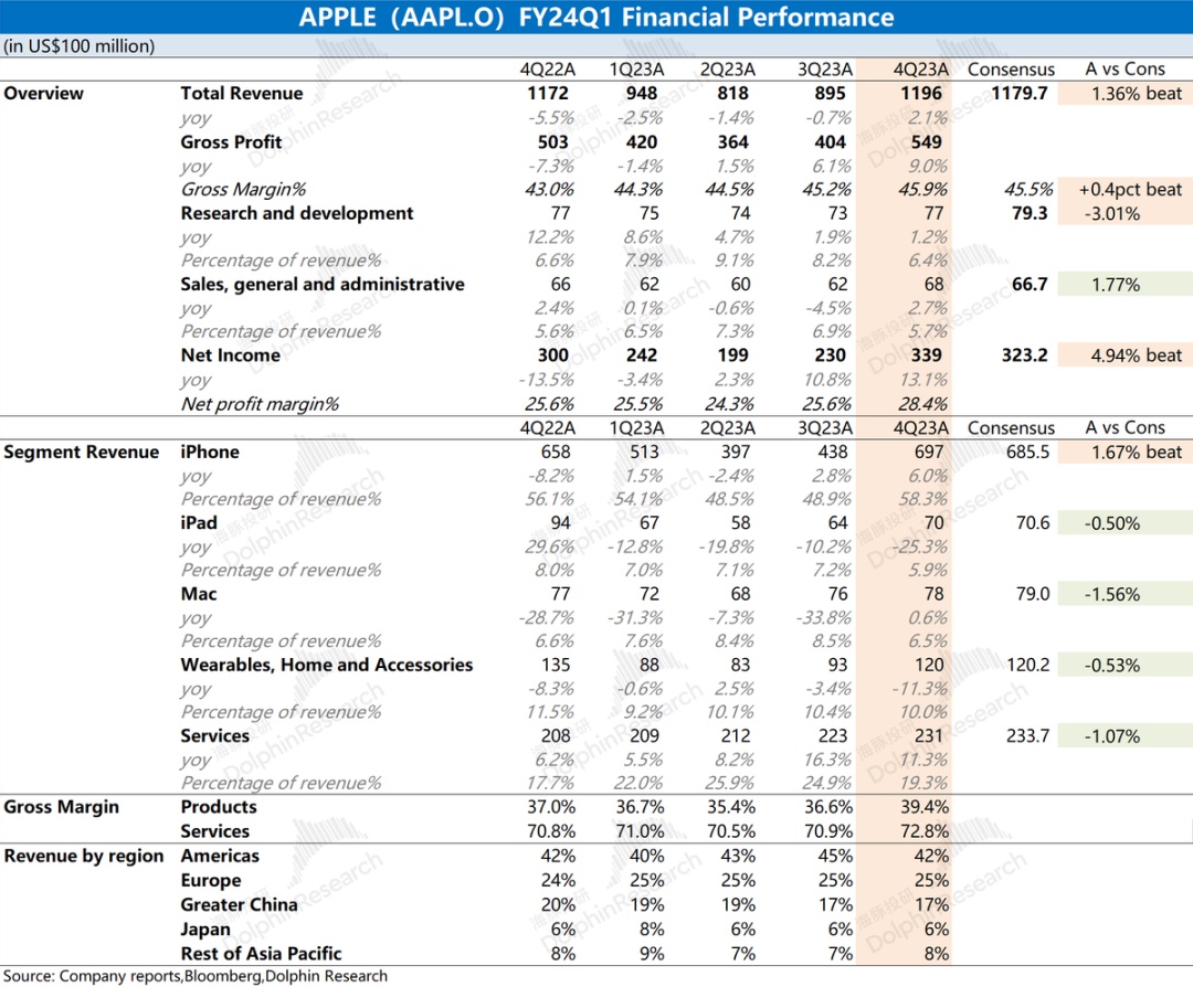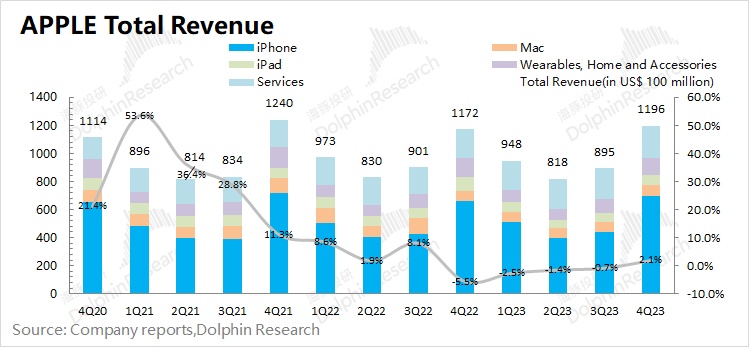 1.1 收入端:2024财年第一季度(即4Q23)苹果公司实现营收1196亿美元,同比增长2.1%,略超市场一致预期(1180亿美元)。对于本季度收入略有上升,主要受iPhone和服务收入增长的带动。