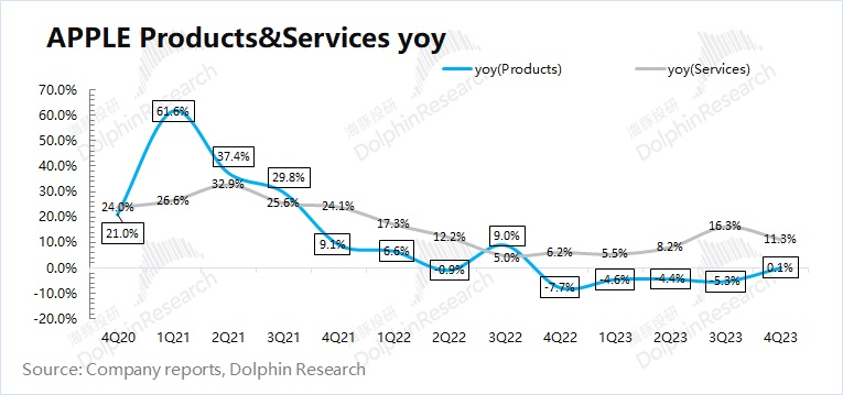3、iPhone 以外其他硬件:基本符合预期。iPad和可穿戴等其他硬件业务,本季度均有两位数的同比下滑,是公司本季度最大的拖累项。终端需求不足,直接影响了硬件端的表现。