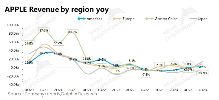 这主要是因为大中华区竞争加剧,安卓品牌有所复苏。具体来看,美洲地区和欧洲地区是苹果的前两大收入来源,本季度分别增长2.1%和9.8%,而大中华区出现了12.9%的下滑。