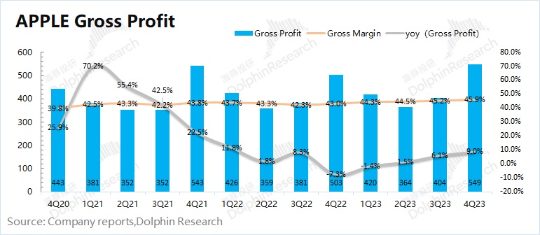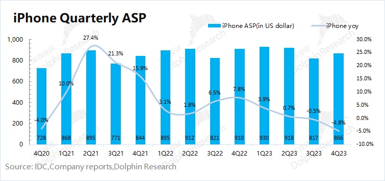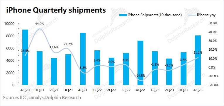 1)iPhone 出货量:根据IDC的数据,2023年第四季度全球智能手机市场同比增长8.6%。苹果本季度出货量增速为11.3%左右,公司的出货量增长表现略优于整体市场;