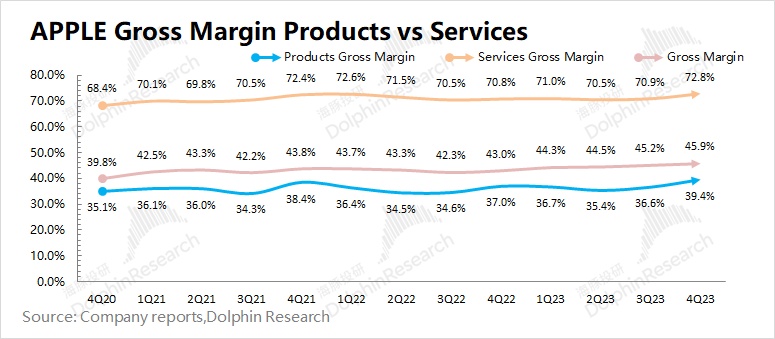 1.2 毛利率:2024财年第一季度(即4Q23)苹果公司毛利率45.9%,同比增加2.9pct,小超市场一致预期(45.5%)。本季度公司毛利率继续回升,主要是因为硬件端毛利率继续走高所致。