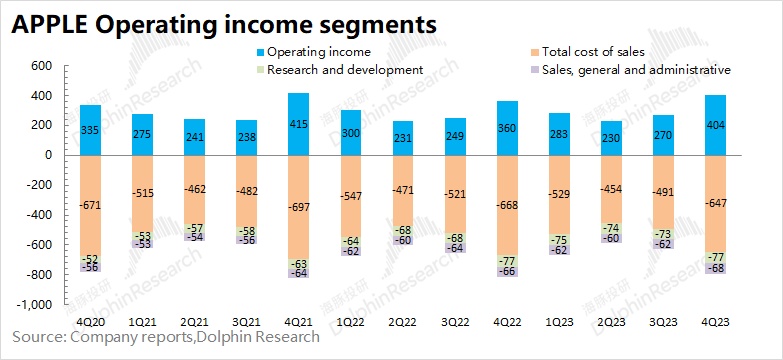 1.3 经营利润:2024财年第一季度(即4Q23)苹果公司经营利润404亿美元,同比增长12.1%。苹果公司本季度经营利润的增加,主要是毛利率提升所致。