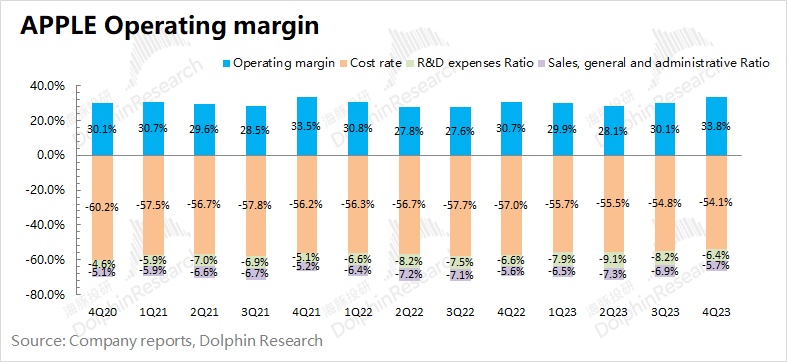 本季度苹果公司的经营费用率15%,同比增长0.4pct。本季度公司的销售费用和研发费用表现相对平稳。