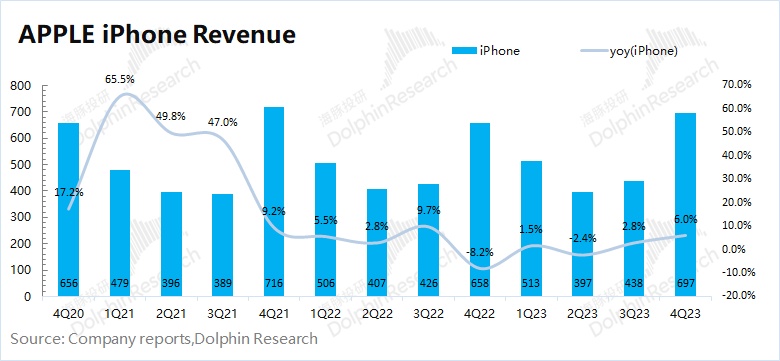 2024财年第一季度 iPhone 业务收入697亿美元,同比增长6%,小超市场一致预期(658亿美元)。本季度全球手机市场出货量同比有个位数增长,而公司手机业务表现与整体市场相近。