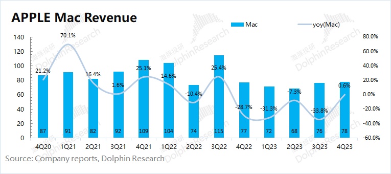 2024财年第一季度 Mac 业务收入78亿美元,同比增长0.6%,基本符合市场预期的(79亿美元)。