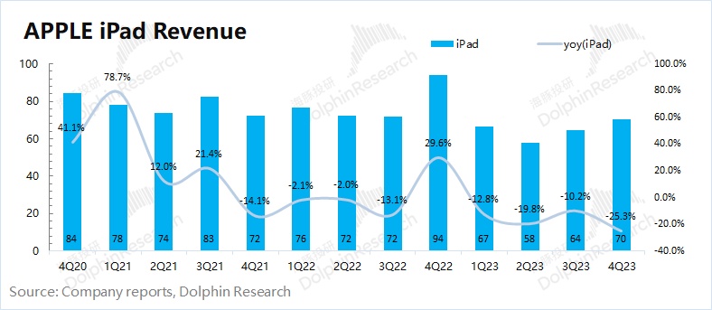 2024财年第一季度 iPad 业务收入70亿美元,同比下滑25.3%,符合市场一致预期(70.6亿美元)。iPad业务的当前下游整体需求疲软,导致该业务收入持续低迷,仍需要新品来带动。