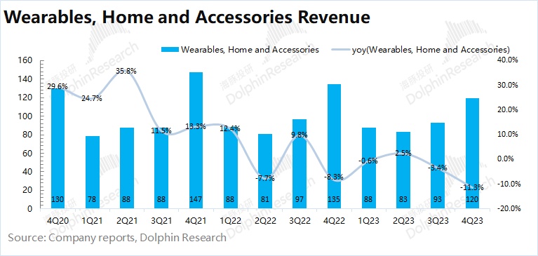 2024财年第一季度可穿戴等其他硬件业务收入120亿美元,同比下滑11.3%,符合市场一致预期(120.2亿美元)。苹果的可穿戴等其他硬件业务本季度继续下滑,主要是由于市场对可穿戴产品的需求疲软导致。结合高通的同比下滑32%的IoT业务来看,整体市场表现仍旧低迷。