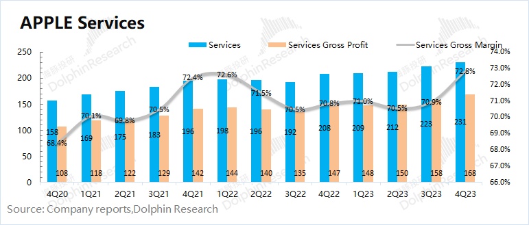 4、软件服务:再创新高。软件服务本季度收入231亿美元,与市场一致预期接近(233.7亿美元)。本季度软件业务的收入和毛利率都创出新高。软件服务仍是公司最稳健的部分,业务持续增长。即使在硬件端不太增长的情况下,公司软件业务仍有两位数的增长。