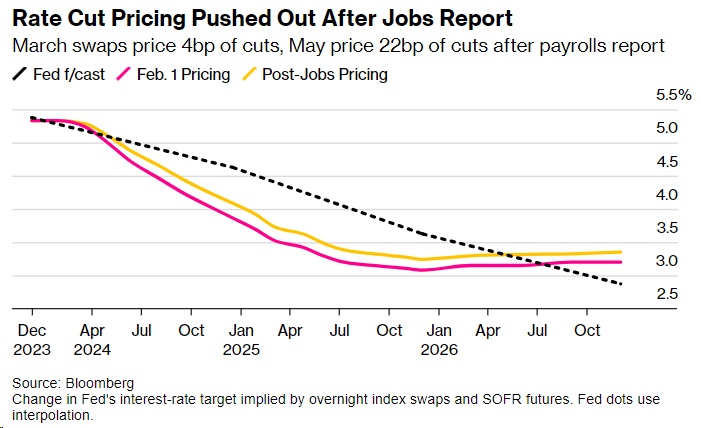 “随着通胀率持续下降,美联储可能会降息三到四次,” Wisdom Tree Investments固定收益策略主管Kevin Flanagan表示。但他表示,1月就业增长和薪资跳升确实“挑战了美国国债市场的说法,即就业市场将疲软到美联储将大举放宽政策的程度。”