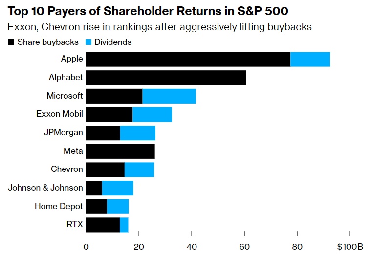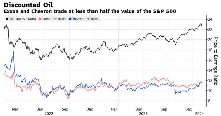 埃克森美孚(XOM.US)和雪佛龙(CVX.US)正在向股东提供自十多年前鼎盛时期以来从未有过的回报,去年它们向股东返还了587亿美元;而且即使原油价格下跌,2024年也预计将向股东返还更多现金。然而,石油巨头们现在却难以在由科技股主导涨势的美股市场中展开竞争。