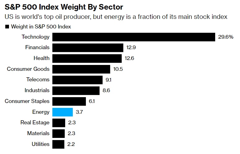 美国现在是世界上最大的石油生产国,产量比沙特阿拉伯高出45%左右,这在很大程度上要归功于埃克森美孚和雪佛龙在德克萨斯州和新墨西哥州的二叠纪盆地的疯狂钻探。尽管全球经济正在努力转型,但这种燃料的需求仍然很高,预计到2030年甚至更长时间,其消费量将会上升。但投资者似乎并不在意。能源股仅占标普500指数的3.7%。