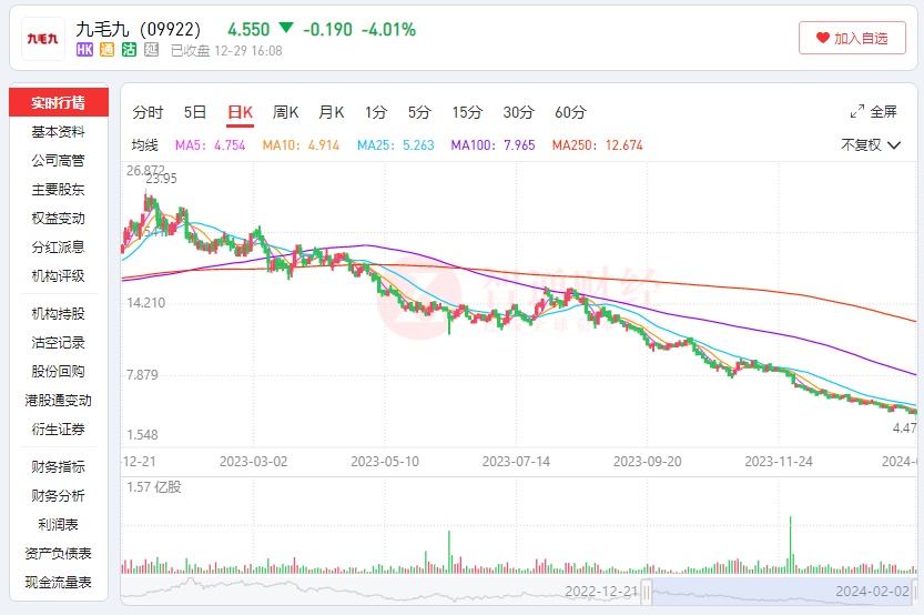 但是,尽管九毛九交出靓丽成绩单,二级市场仍然不买账。虽然营收和净利双双高增长,但九毛九的股价表现却异常“背离”。截至发稿,九毛九4.55港元的股价创历史新低。自去年8月22日披露中报以来,该股价累跌超65%,较曾经的最高价38.59港元下跌逾90%。