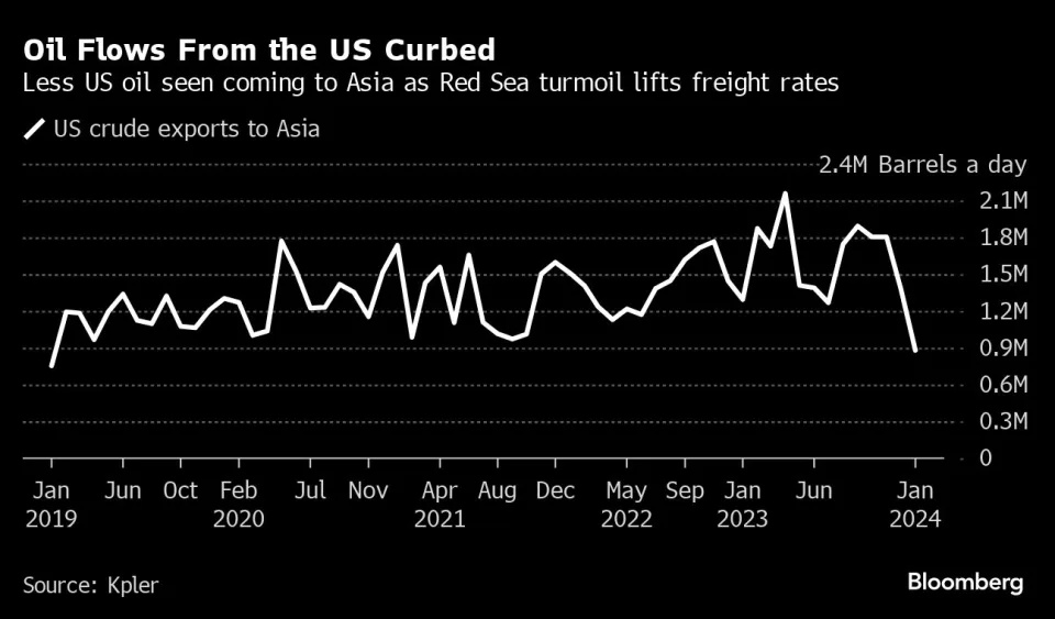 红海袭击的影响正通过更高的运输成本影响油价,这正鼓励炼油厂尽可能地在当地生产。Kpler表示,自12月中旬以来,从中东到西北欧的苏伊士型油轮的运费已经上涨了约一半。同期,全球基准布伦特原油价格上涨了约8%。