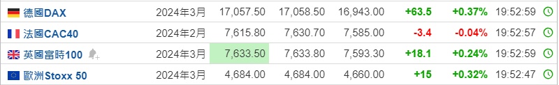 2. 截至发稿,德国DAX指数涨0.37%,英国富时100指数跌0.04%,法国CAC40指数涨0.24%,欧洲斯托克50指数涨0.32%。