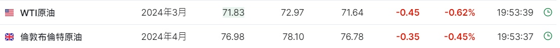 3. 截至发稿,WTI原油跌0.62%,报71.82美元/桶。布伦特原油跌0.43%,报76.98美元/桶。