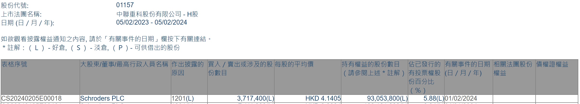 智通财经APP获悉,香港联交所最新资料显示,2月1日,Schroders PLC减持中联重科(01157)371.74万股,每股作价4.1405港元,总金额约为1539.19万港元。减持后最新持股数目为9305.38万股,最新持股比例为5.88%。