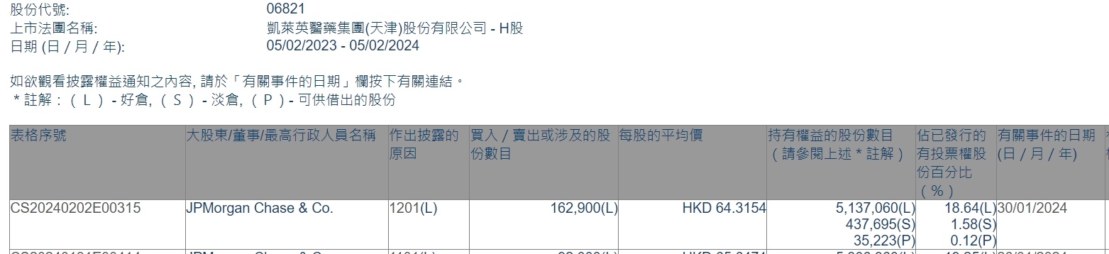 智通财经APP获悉,香港联交所最新资料显示,1月30日,小摩减持凯莱英(06821)16.29万股,每股作价64.3154港元,总金额约1047.70万港元。减持后最新持股数目约为513.71万股,最新持股比例为18.64%。