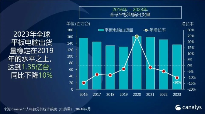 智通财经APP获悉,Canalys发文称,2023年第四季度,全球平板电脑出货量同比下降11%,总计3780万台。2023年全年,平板电脑的出货量同样同比下跌10%,达1.353亿台。中国和印度是平板电脑出货的主力市场,在一定程度上抵消平板电脑在全球其他市场的疲软。