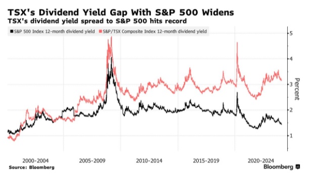 根据美国银行的数据,标普/多伦多证券交易所综合指数3.2%的股息收益率是美国标普500指数水平的两倍多,创下了历史新高。