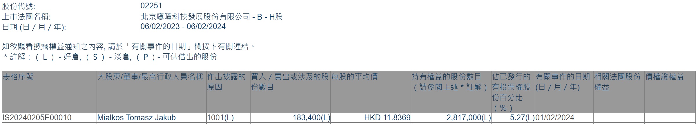 智通财经APP获悉,香港联交所最新资料显示,2月1日,Mialkos Tomasz Jakub增持鹰瞳科技-B(02251)18.34万股,每股作价11.8369港元,总金额约为217.09万港元。增持后最新持股数目为281.7万股,最新持股比例为5.27%。