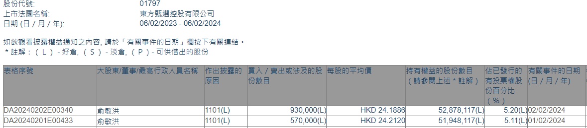 智通财经APP获悉,香港联交所最新资料显示,2月1日-2日,公司主席兼执行董事俞敏洪分别增持东方甄选(01797)57万股、93万股,每股分别作价24.2120港元、24.1886港元,总金额约为3629.62万港元。增持后最新持股数目为5287.81万股,最新持股比例为44.78%。