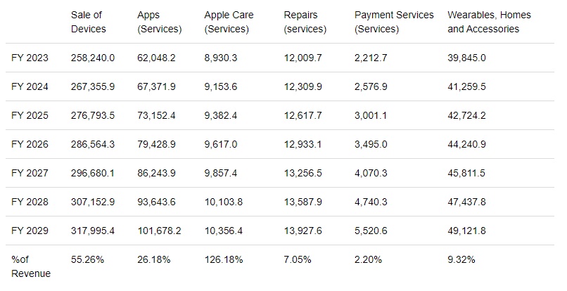 而如果以苹果产品所属细分市场的可用市场趋势为基础,即设备的销售额预计将以3.53%的速度增长,应用程序的销售额将增长8.58%,维修和AppleCare的销售额将增长2.5%,苹果支付服务的销售额将增长16.46%,配件的销售额将与设备的销售额一样增长3.5%,可以得出更加乐观的结果。