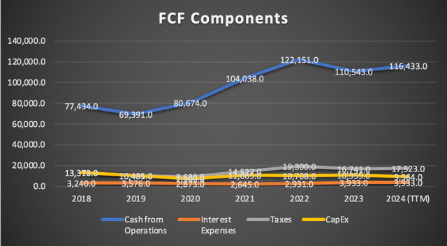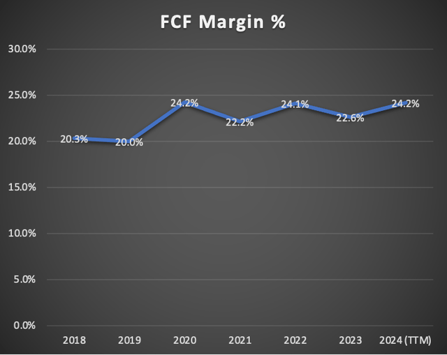 此外,自由现金流有所改善。目前,该公司的自由现金流为932.7亿美元。FCF利润率增加到24.2%。这一改善归因于运营现金(1164.3亿美元)的增加,以及资本支出(95.6亿美元)的减少。